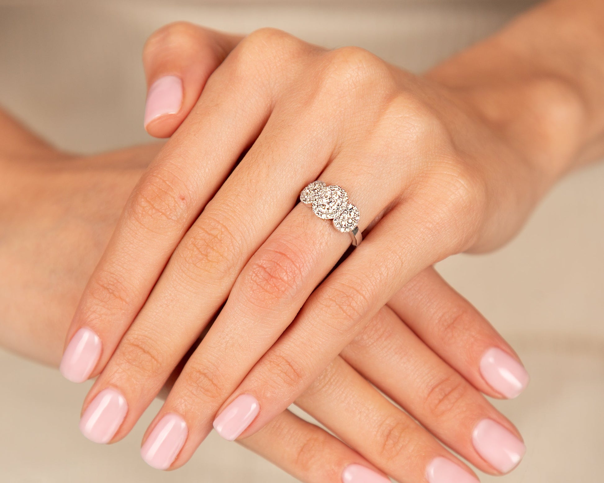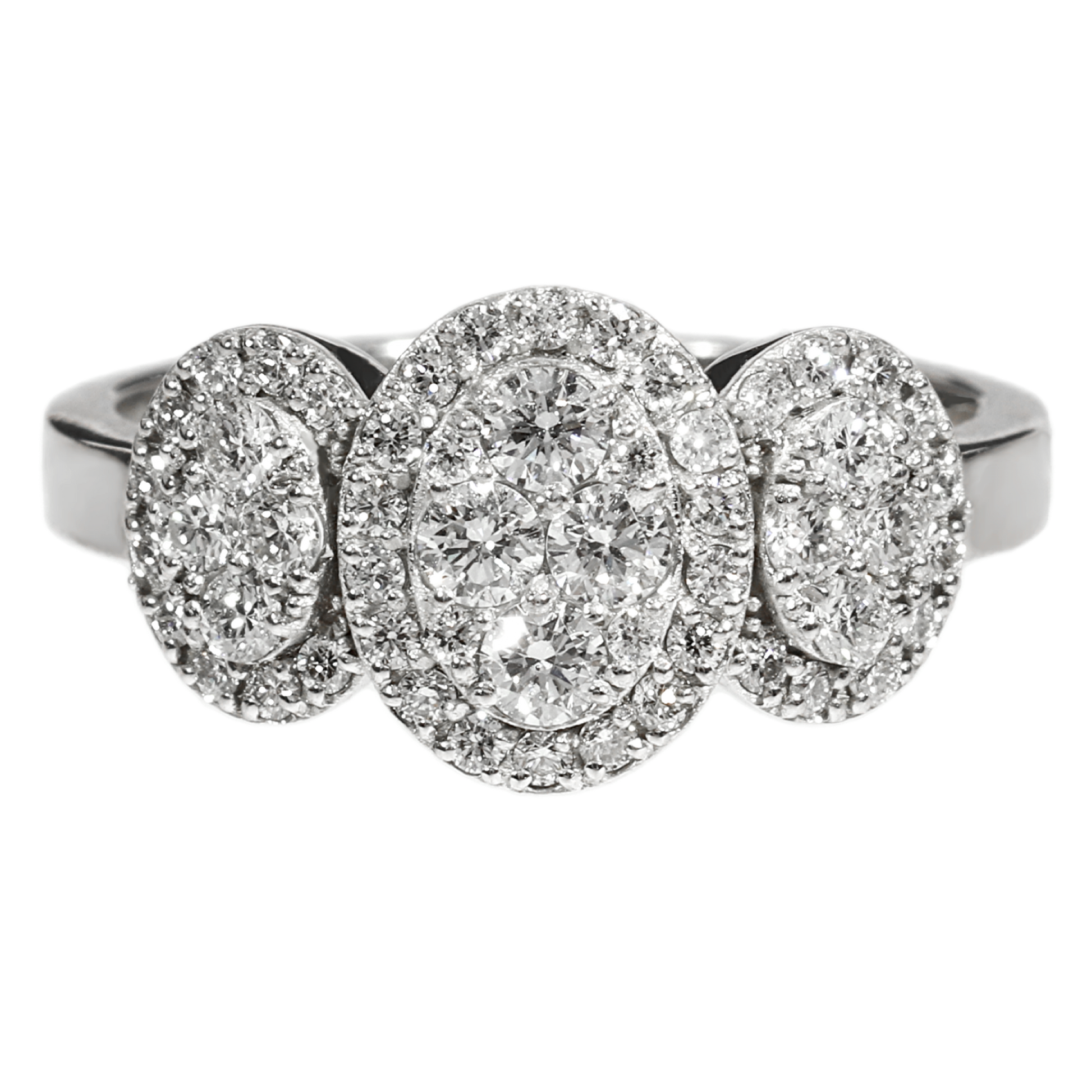 This stunning natural diamond ring features a unique design with three sparkling oval clusters, each adorned with brilliant-cut diamonds. The intricate detailing and high polish create a mesmerizing effect, making it the perfect statement piece of any occasion.