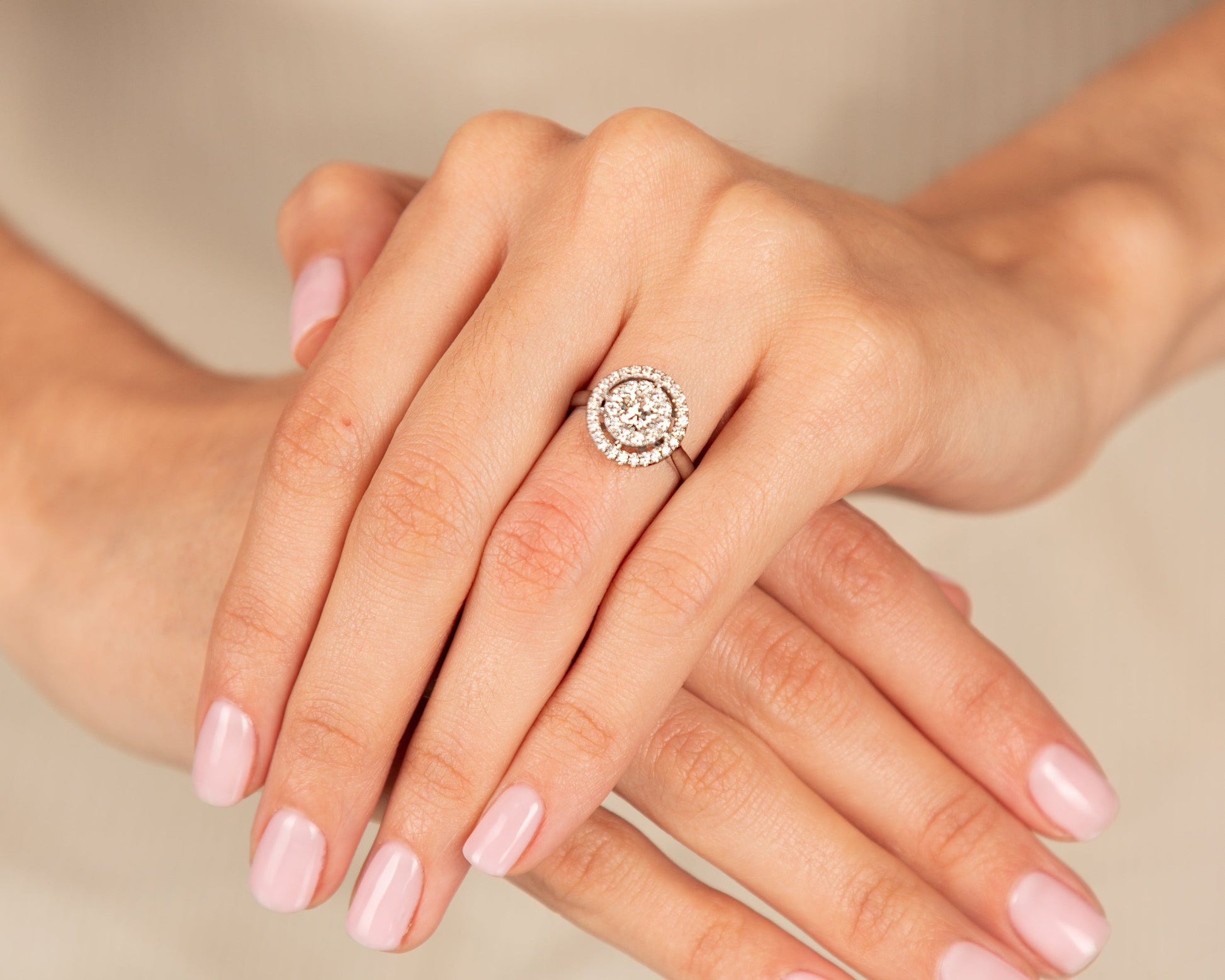 This exquisite diamond ring features a stunning oval centerpiece surrounded by a halo of smaller diamonds, all set in a sleek band. The brilliance of the stones is enhanced by the elegant design, making it a perfect choice for special occasions or as a timeless gift.
