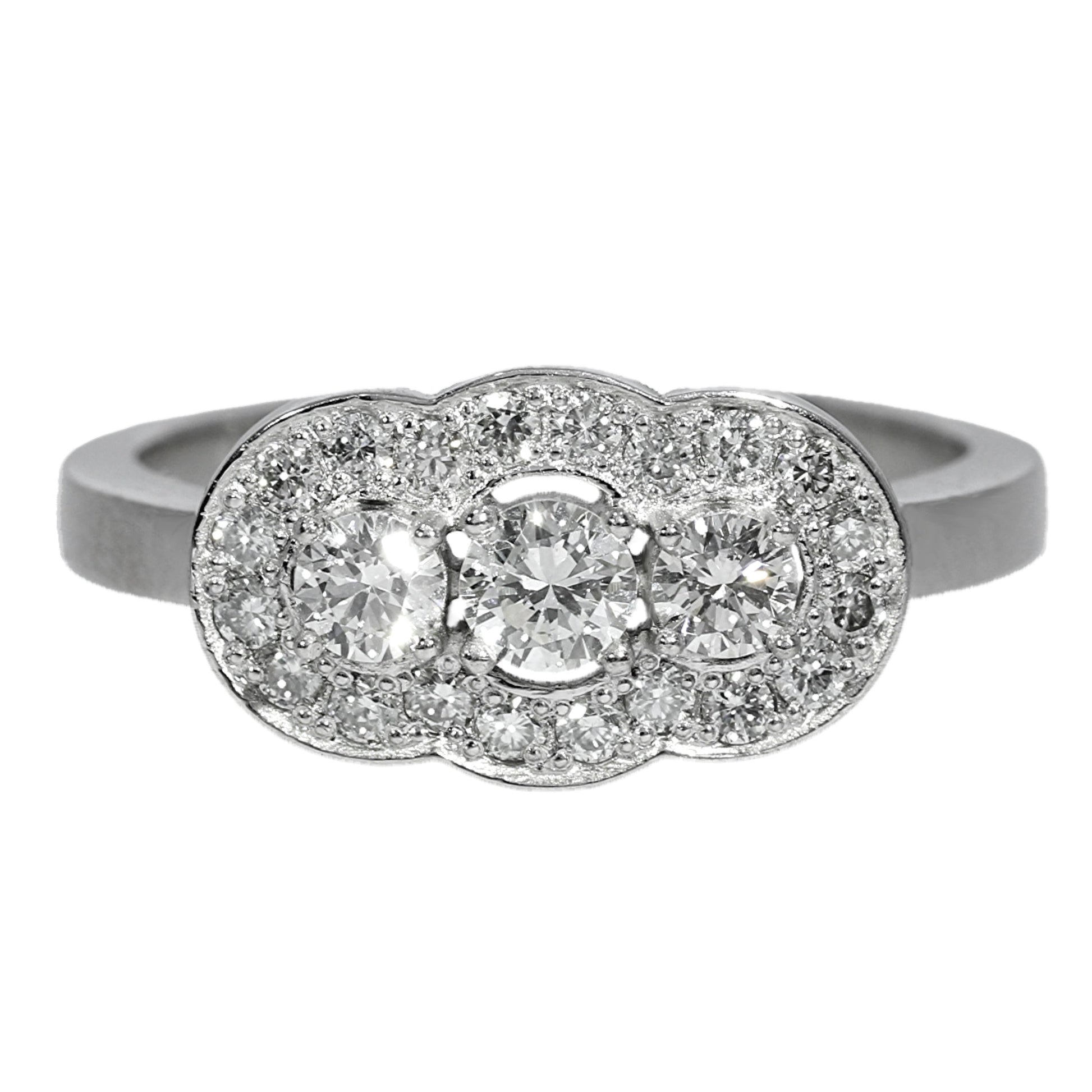 This stunning natural diamond engagement ring features a unique design with three sparkling diamonds, adorned with a brilliant-cut diamonds. The intricate detailing and high polish create a mesmerizing effect, making it the perfect statement piece for any occasion.
