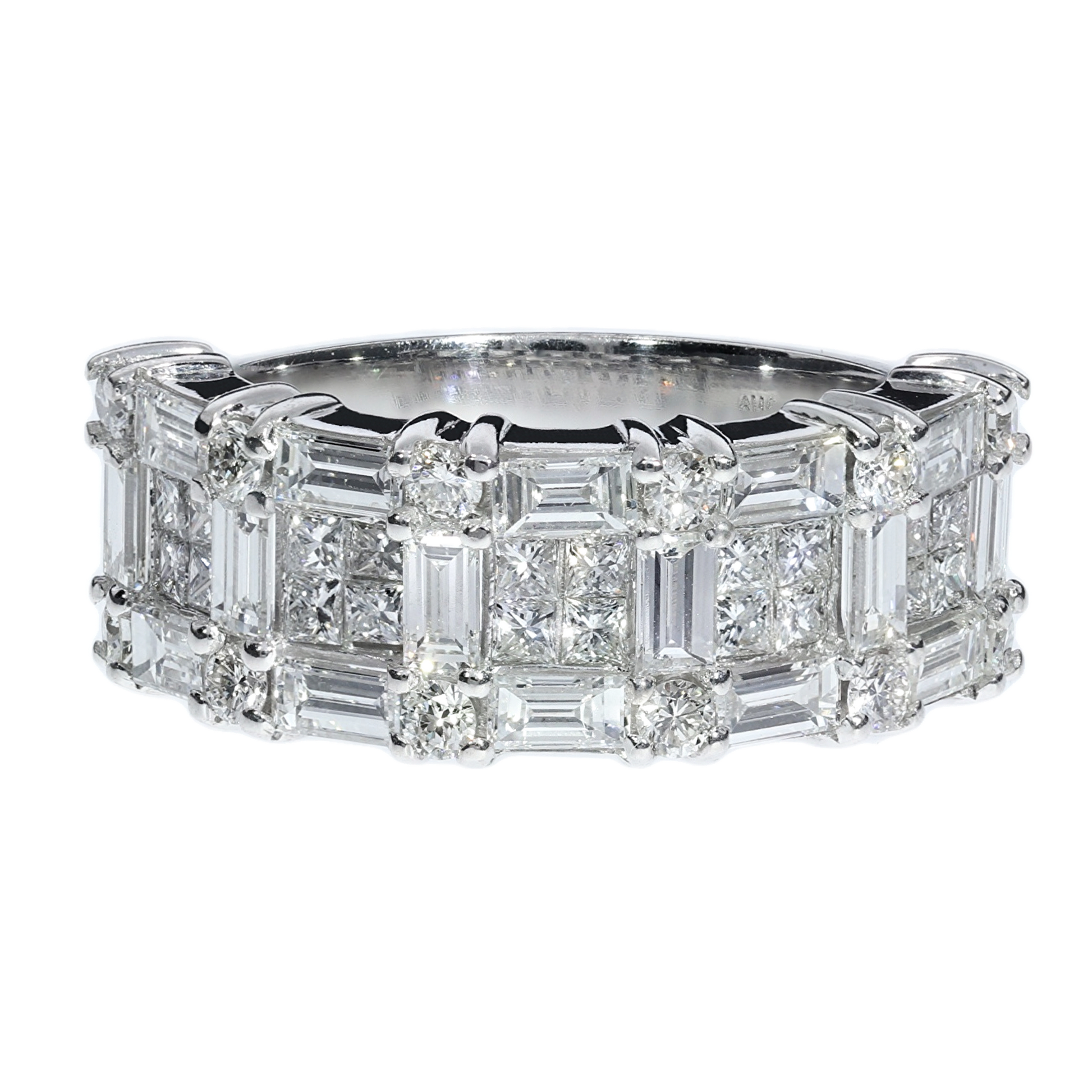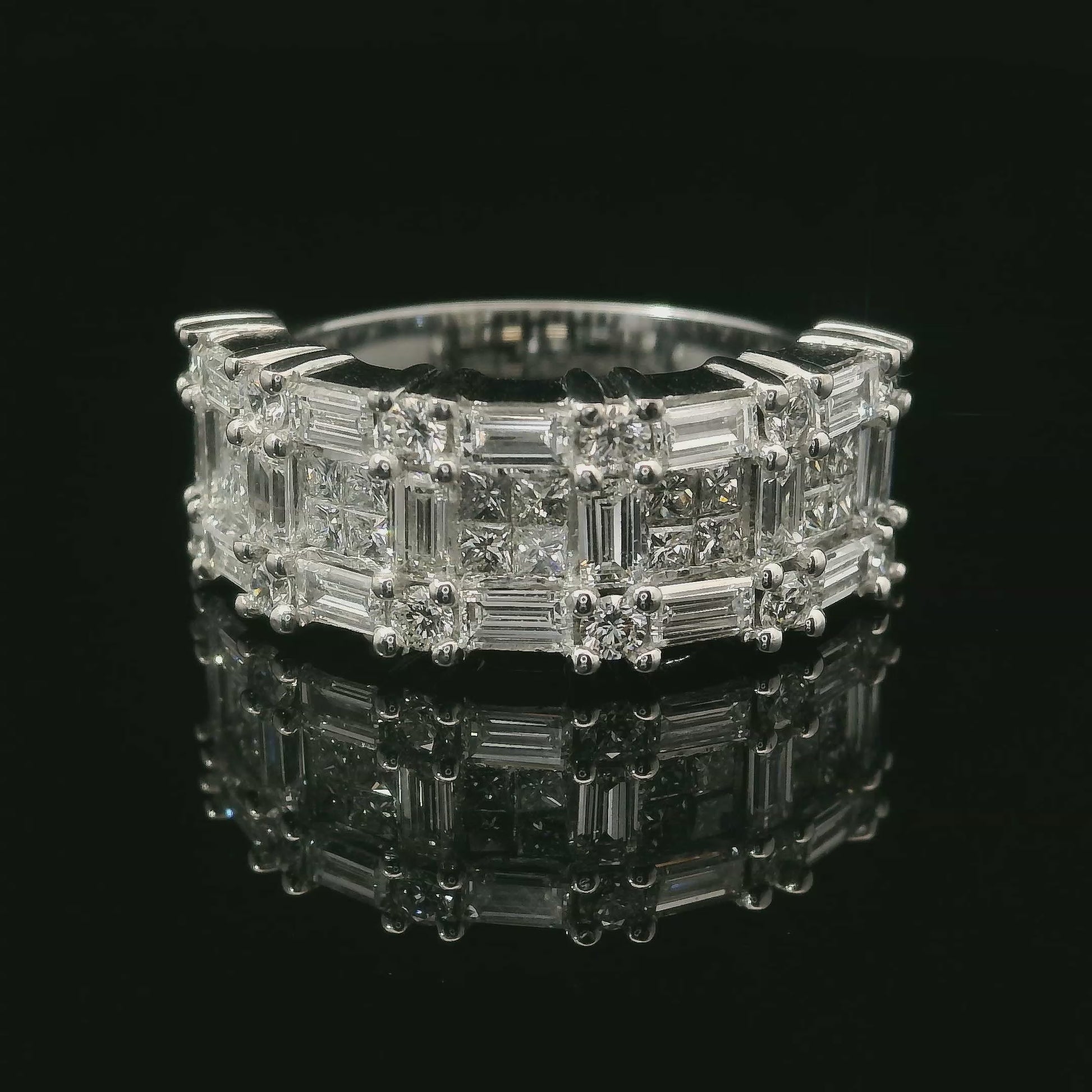 This half-ribbon ring with one row of brilliant baguette and princess cut diamonds is a modern and sophisticated piece of art. Perfect for engagement or special occasions to embrace a magnificent lasting moment.