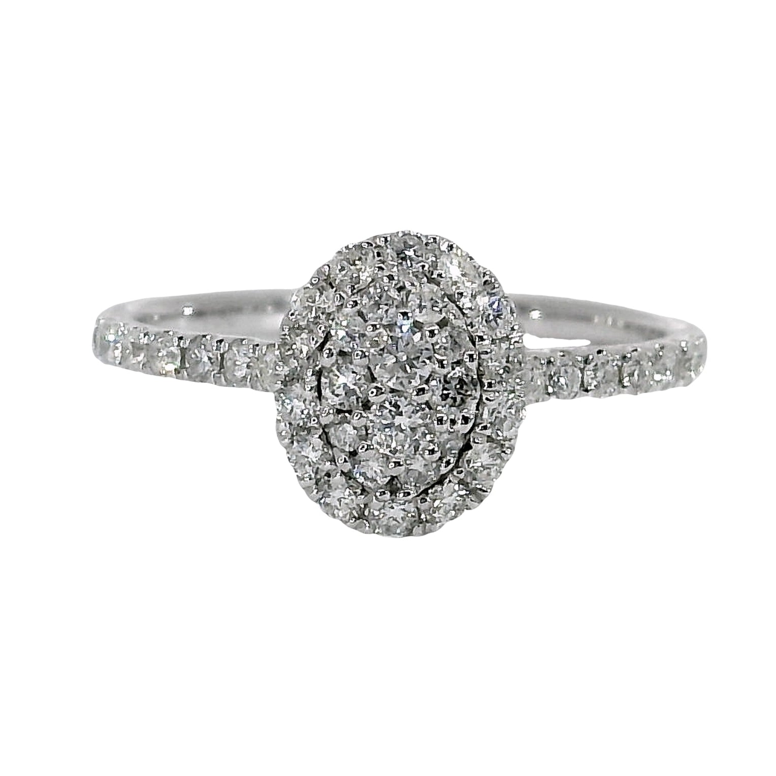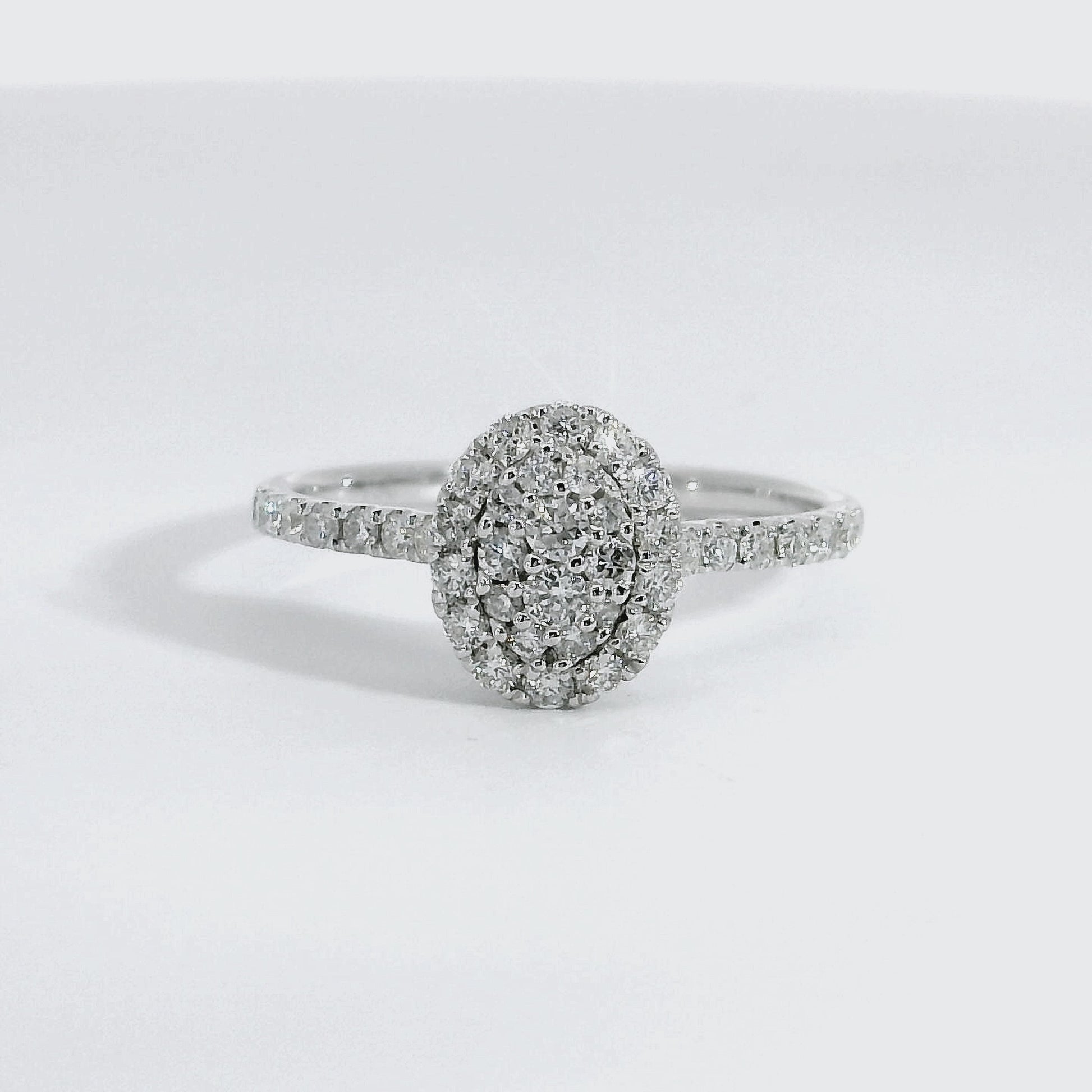Discover the timeless beauty of this elegant diamond halo gold ring. Crafted with precision, it features a stunning oval center stone surrounded by a sparkling halo of smaller diamonds, creating a captivating effect. Perfect for engagements or special occasions, this ring is a symbol of love and commitment.
