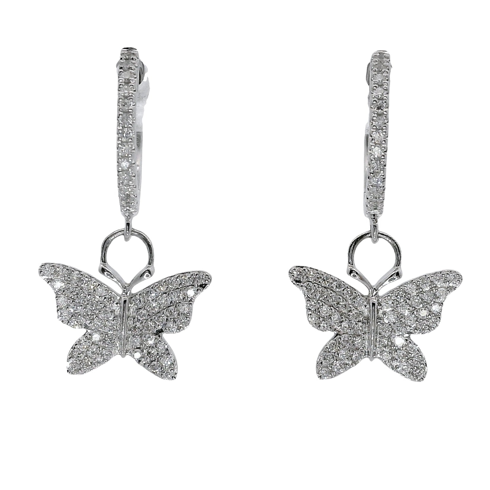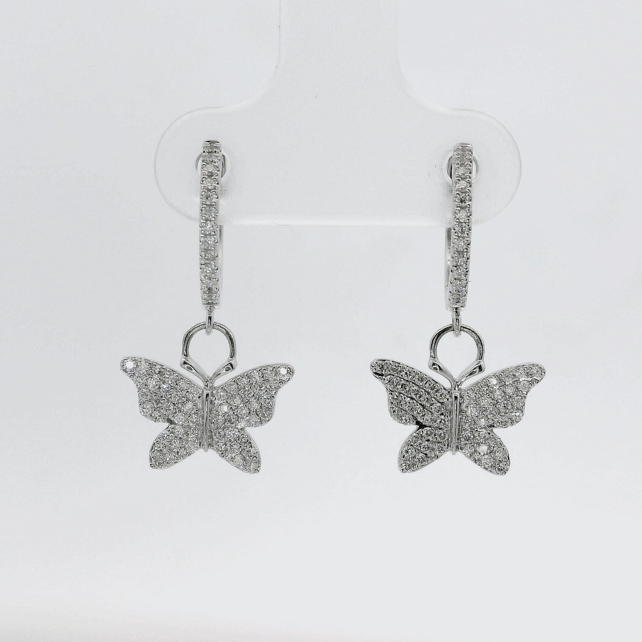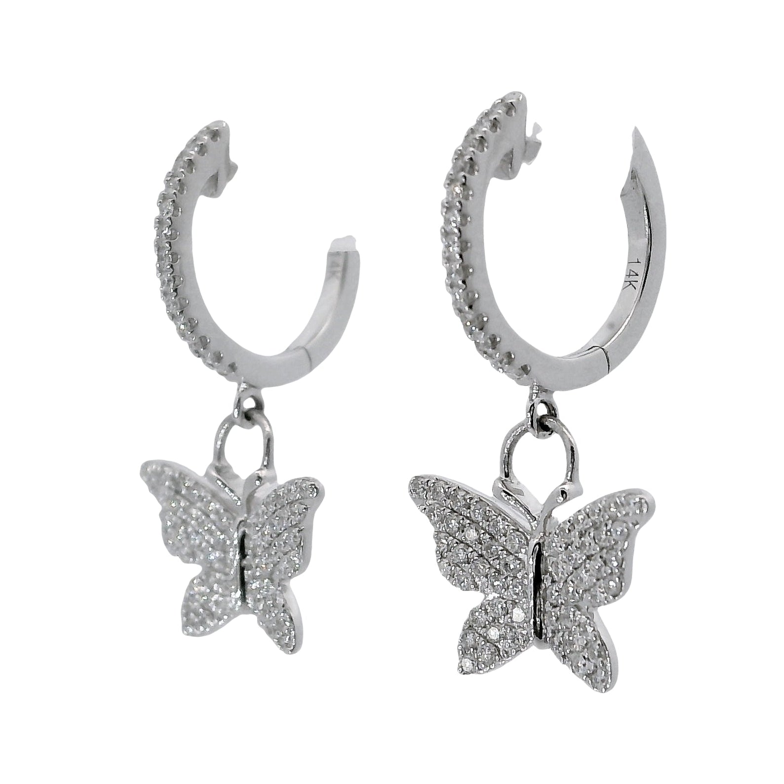 Elevate your ensemble with these exquisite dangle earrings, crafted in lustrous white gold. Each earring features a delicate, butterfly design adorned with round-cut diamonds set in a brilliant style. These earrings will add a touch of elegance and sophistication to any occasion.